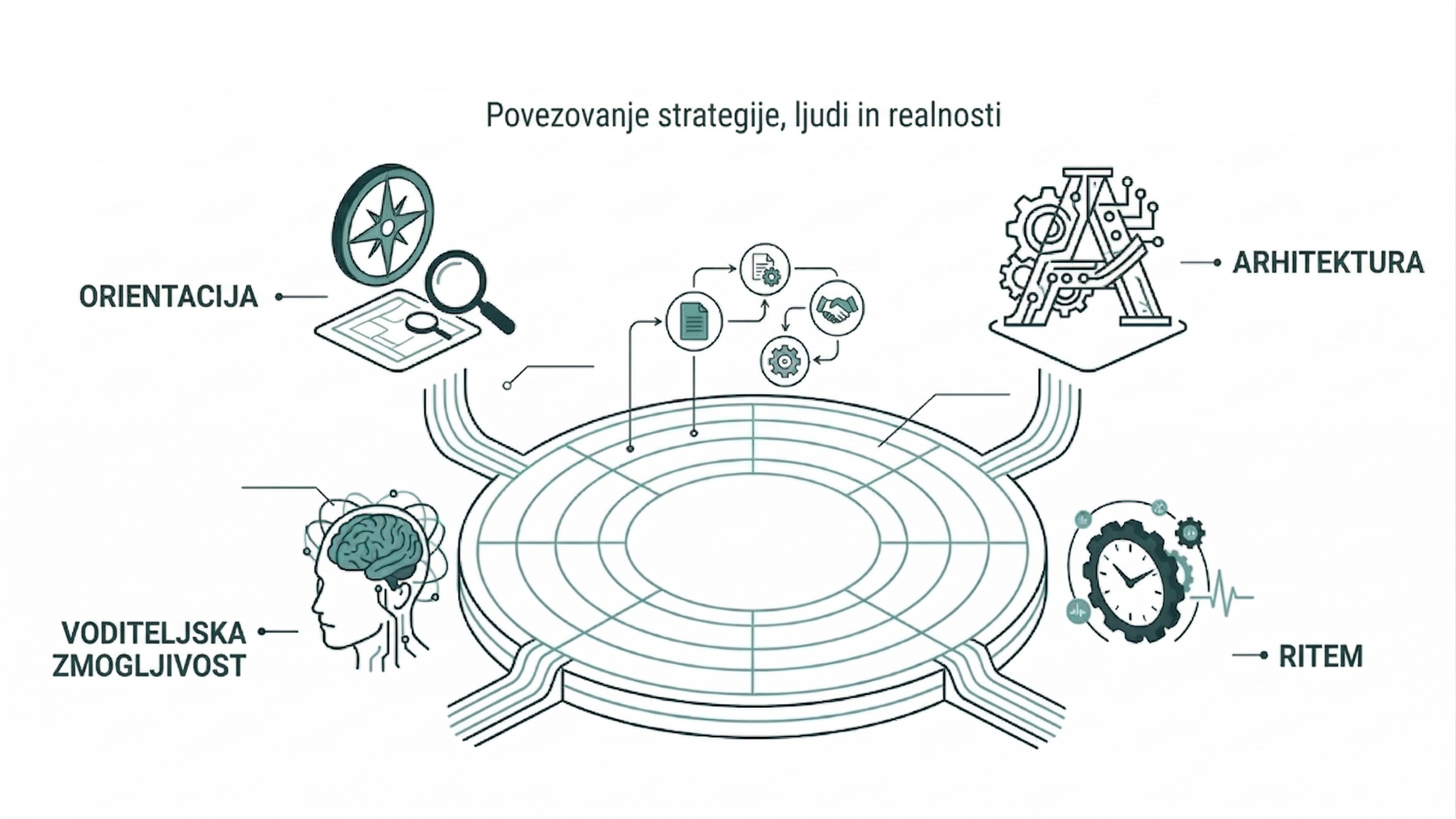 Kratka strateška diagnostika za vodstvene ekipe, ki vodijo spremembe v kompleksnih okoljih. Pomaga prepoznati, kje pritisk zmanjšuje jasnost, kapaciteto in koherenco.